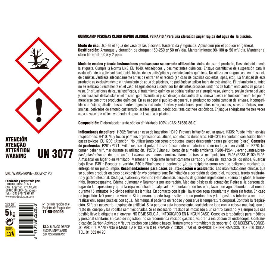 Producto clorado con acción rápida desinfectante para tratamiento de arranque, choque o si se desea una cloración rápida del agua de la piscina (hipercloración). El uso del producto es para aplicación en el vaso la piscina.