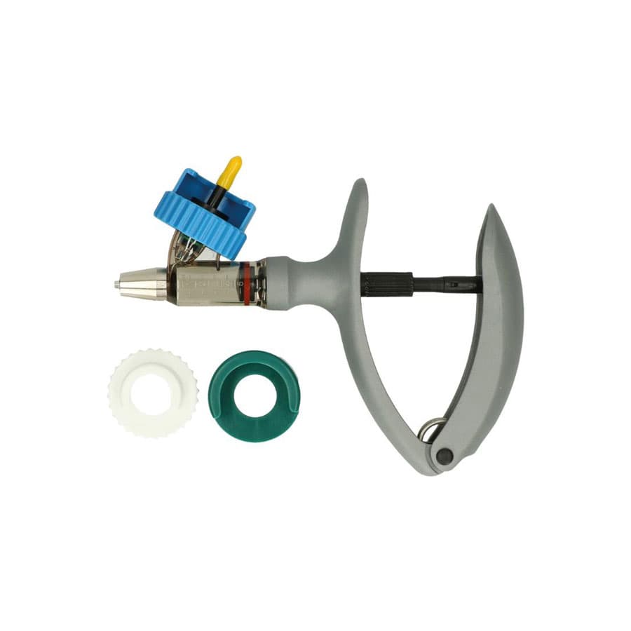 - Adaptador universal de tres piezas (20 mm, 30 mm y 33 mm) que permite montar un frasco de medicamento en la parte superior de la jeringa, para que se llene solo.
